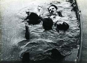 Frack und mit Zylinderhut. Alles endet im Wasser,