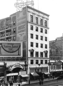 Garrick Theatre (on left side), exterior by day, poster on roof
