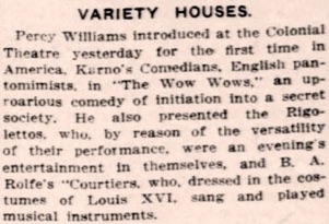 mit dem Colonial Theatre auf, der Text dazu mit Karno´s Comedians,