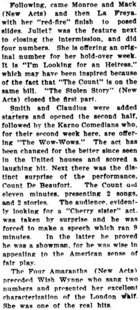 The act has been changed for the better since seen in the United houses and scored a laughing hit.“ (...)