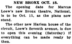 The opening date for Marcus Loew‘s Bronx theatre, National,
