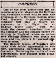 when Fred Karno´s English pantomime company will play a return engagement in A Night in a English Music Hall. This will