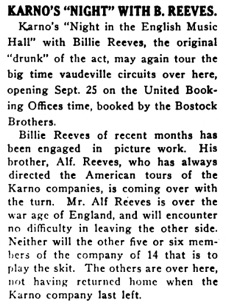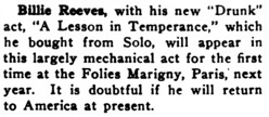 Editorial content. „Billie Reeves, with his new ,Drunk‘ act,