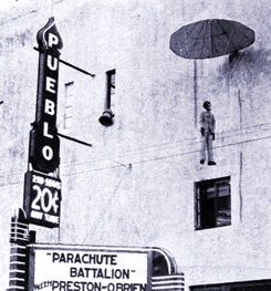 Pueblo Theatre, exterior by day, marquee Parachute Battalion, Pueblo, Colorado, 1941, Cinema Treasures