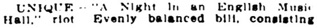 Hall, riot. Evenly balanced bill, consisting of La Vier; Barto & Clark; White & La Fleur; Graham & Randall.“