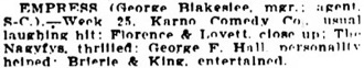 close up; The Nagyfys, thrilled; George F. Hall, personality helped; Brierie & King, entertained.