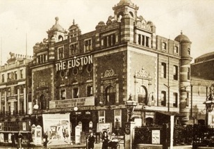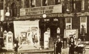 sign above main entrance (unreadable) advertising ,Fred Karno‘s Comedians in Saturday to Monday,‘ circa 1910, postcard