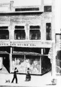 Tramp (left) in front of Beane-Vandever Dry Goods Co.,