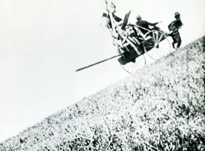 hochgehobene Charlie mit seinem Karren und dem ihn voran