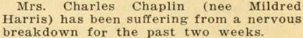 „Mrs. Charles Chaplin (nee Mildred Harris) has been suffering