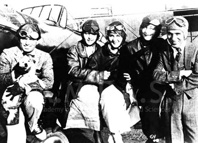 & Douglas Fairbanks with dog, Marjorie Daw, Mary Pickford, unidentified, and Charles Chaplin in front of airplane,