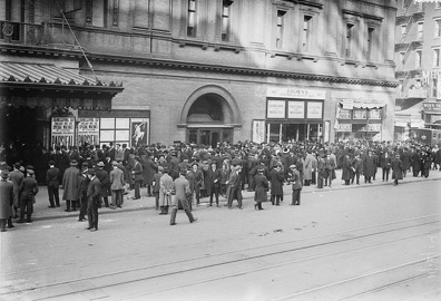 & Crowd to buy Opera tickets, Met, exterior by day, New York,