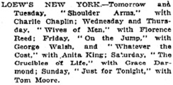 Charlie Chaplin in Shoulder Arms will be shown at Loew‘s