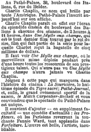 Editorial content. „Au Pathé-Palace, 32, boulevard des Italiens,