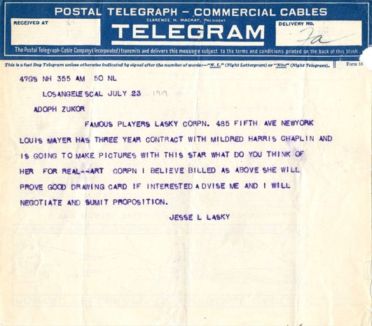 Telegram from Jesse L. Lasky to Adolph Zukor,