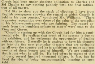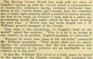 The Moving Picture World last week told the story of Chaplin‘s signing up with the Circuit, which is representative of