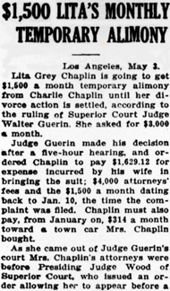 Lita Grey Chaplin is going to get $1,5000 a month temporary