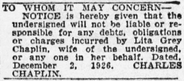 incurred by Lita Grey Chaplin, wife of the undersigned, or any