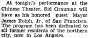 Tonight‘s Performance Dedicated to Mayor James Rolph, Jr.,
