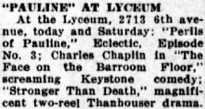 At the Lyceum (...) today and Saturday: Perils of Pauline,