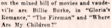 and vaudeville are Billie Burke, in Gloria‘s Romance, The Fireman