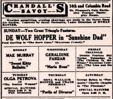 Advertisement. „Crandall´s Savoy. Weather permitting, evening showings in the Savoy Open Air Garden. Concerts by Savoy