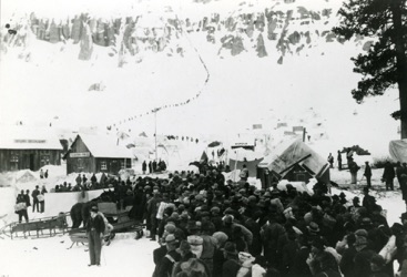 vorne links im Bild. Eine Schürferkolonne, dargestellt von Arbeitslosen, kämpft in bitterer Kälte am Berg. Aussenaufnahmen zu The Gold Rush, 1925