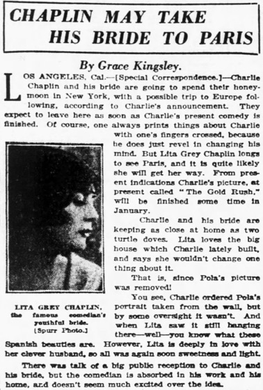 LOS ANGELES, Cal. – (Special Correspondence.) – Charlie Chaplin and his bride are going to spend their honeymoon