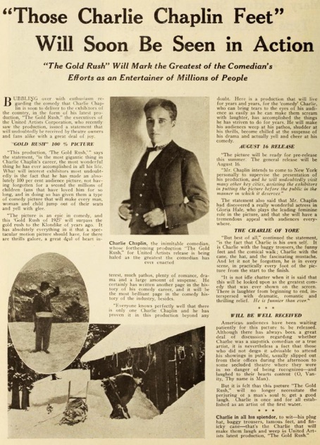 of the country, in the form of his latest production, The Gold Rush, the executives of the United Artists Corporation, who recently saw the production, issued a statement that will undoubtedly be received by theatre owners and fans alike with a great deal of joy.
