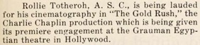 Editorial content. „Rollie Totheroh, A. S. C., is being lauded