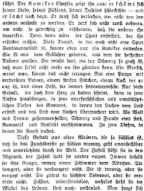 wandelt Chaplin in seiner gewohnten Tracht, sogar das kokett geschwungene Spazierstöckchen fehlt nicht.“ (...)
