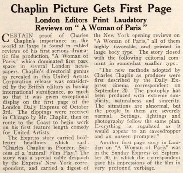 drama A Woman of Paris, for a four weeks‘ engagement,