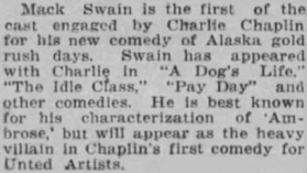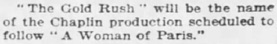Editorial content. „The Gold Rush“ will be the name of the Chaplin production scheduled to follow A Woman of Paris.“