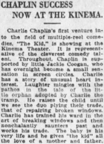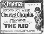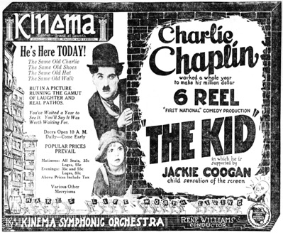Charlie Chaplin‘s first venture into the field of multiple-reel comedies, „The Kid,“ is showing at the Kinema Theater.
