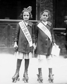 Two girls in roller skates wear „Don‘t Be A Scrab“ sashes,