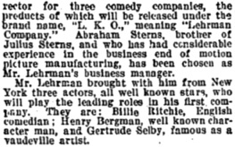 released under the brand name, ,L. K. O.,‘ meaning ,Lehrman Company.‘ Abraham Sterns, brother of Julius Sterns,