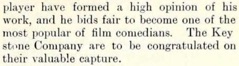 work, and he bids fair to become one of the most popular of film comedians. The Keystone Company are to be congratulated