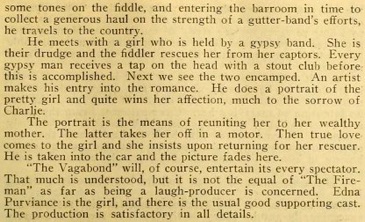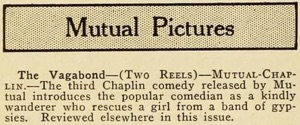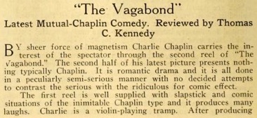 the second reel of The Vagabond.“ (...) „Introduces the popular comedian as a kindly wanderer who rescues