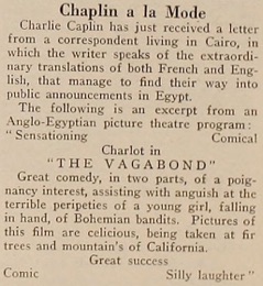 Charlie Chaplin has just received a letter from a correspondent living in Cairo, in which the writer speaks of the extraordinary translations of both French and English, that manage to find their