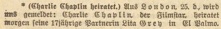 gemeldet: Charlie Chaplin, der Filmstar, heiratet