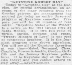 Twenty Minutes of Love is released by Keystone April 16, 1914.