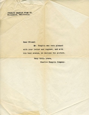 Charlie Chaplin Company fan response letter which accompanied