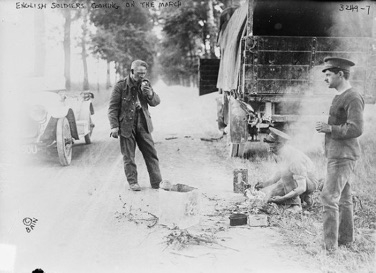 & World War One. Engl. soldiers cooking on the march, 1910s.