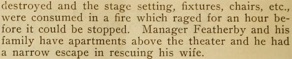 the stage setting, fixtures, chairs, etc., were consumed in a fire