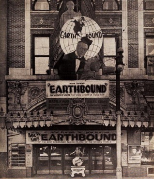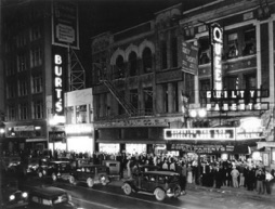 Queen Theatre, exterior by night, sign Guilty Parents,