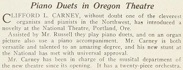Mr. Carney has been in charge of the musical department of the new theatre since its opening. It has a twenty-piece orchestra.