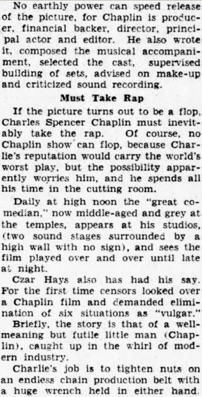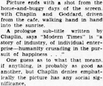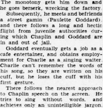Briefly, the story is that of a well-meaning but futile little man (Chaplin), caught up in the whirl of modern industry.“ (...)