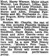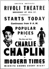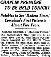 the Chaplin picture, Modern Times, for tomorrow (Thurs.).