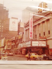 Rivoli, exterior by day, marquee „Justine,“ New York,