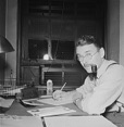 & J. Brooks Atkinson at desk with pipe in the New York Times